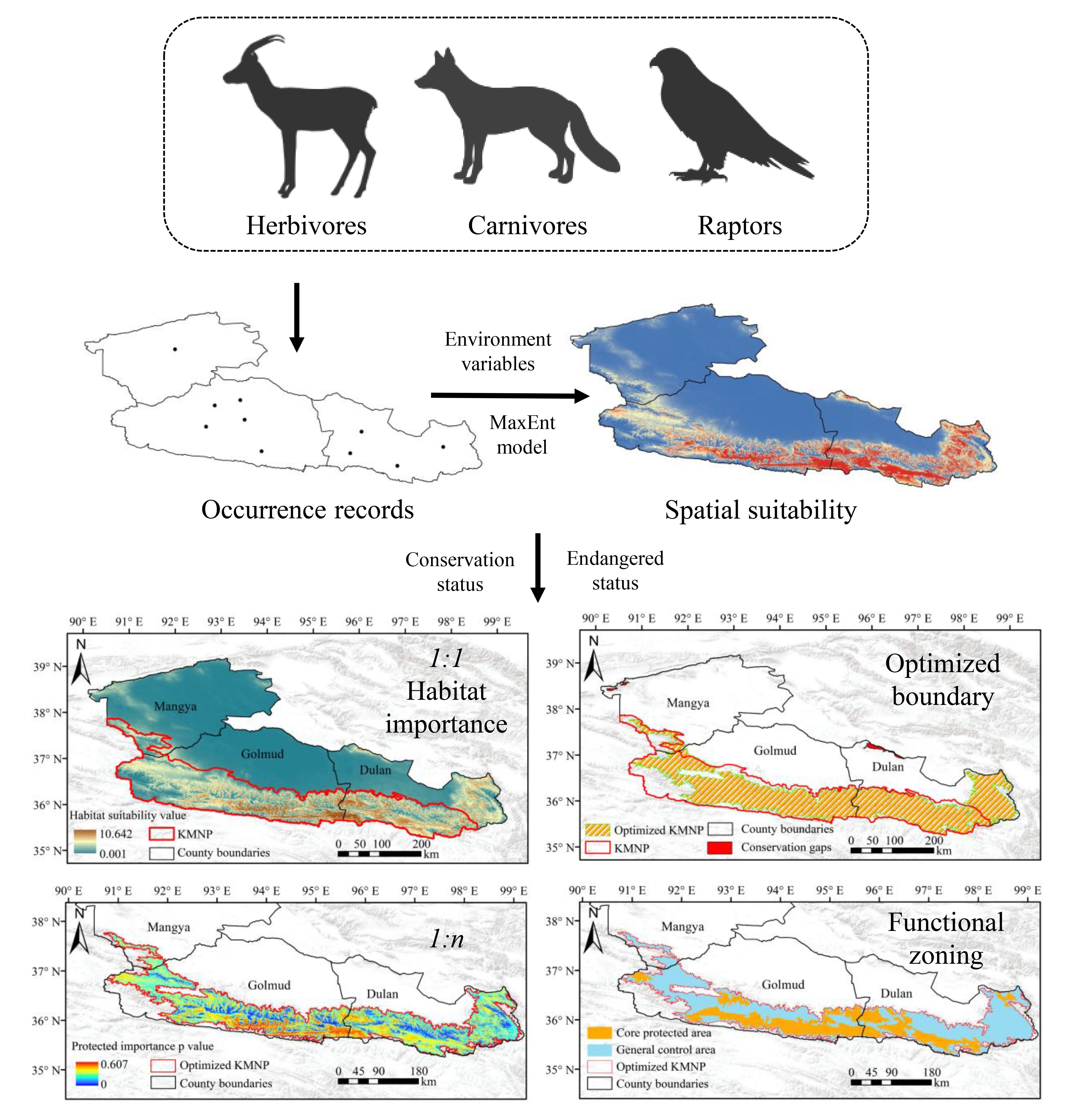 为探究昆仑山国家公园(青海片区)边界范围及功能区域划分,中国科学院西北高原生物研究所动物生态与资源保护研究团队在2021年12月至翌年1月(冬季)和2022年7月(夏季)期间开展昆仑山国家公园(青海片区)候选区的野生动物本底调查,记录了16个国家级保护动物共计4523个位点(优化后为3921个),采用生态位模型开展该区域重要物种适宜栖息地评估研究,并基于不同野生动物的保护现状及濒危现状,开展昆仑山国家公园边界范围及其功能区域划分及其保护空缺研究。研究表明,昆仑山地区重点物种适宜分布于海拔4100 m至4700 m、年平均温度为-2℃至-4.5℃之间的半干旱区,其植被类型为高寒草甸和高寒草原,土地利用类型为草地和未利用土地。不同野生动物在昆仑山地区的适宜空间分布不尽相同,主要集中在昆仑山地区西南部、中部及东南部地区。优化昆仑山国家公园青海片区的面积约为4.98×104 km2,比候选区域面积减少了16.3%,其中核心保护区和一般管控区面积分别为1.63×104 km2和3.32×104 km2。93.75%(15/16)的重点物种在昆仑国家公园核心保护区的适宜性依次高于优化区域、候选区域及茫崖市-格尔木市-都兰县地区,这表明昆仑山国家公园边界范围划分及功能区域划分具有较强的合理性。该研究成果不仅为昆仑山国家公园的保护和管理提供了重要科学依据,有助于维护生态系统、保护生物多样性和促进重点物种的繁衍生存,而且为青藏高原国家公园群的建设和生态文明提供了指导,具有潜在的应用前景。