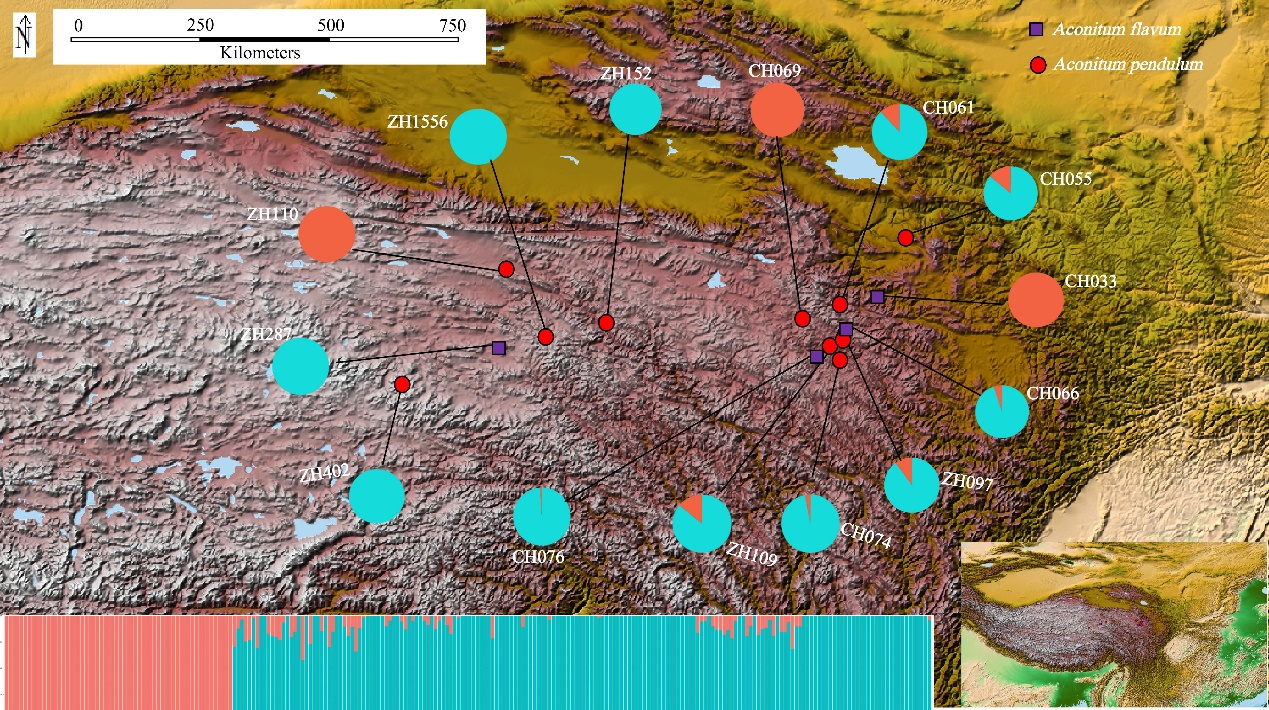 铁棒锤(Aconitum pendulum Busch)和伏毛铁棒锤(Aconitum flavum Hand.-Mazz.)为乌头属(Aconitum L.)多年生的草本植物,主要分布在青藏高原及其毗邻地区。二者具有高度相似的形态特征,是研究青藏高原区域物种形成和演化历史的理想材料。中国科学院西北高原生物研青藏高原植物适应与进化研究团队利用基因分型测序(Genotyping-by-sequencing,GBS)获取全基因组单核苷酸多态性(Single Nucleotide Polymorphism,SNP),以探究二者的物种界限和遗传多样性。结果发现铁棒锤和伏毛铁棒锤均非单系,种间遗传差异小于居群间遗传差异,且具有高度重叠的生态位,因此建议将二者合并为一个物种。基因流和遗传漂变可能是导致居群遗传结构不明显的主要原因。末次盛冰期的气候波动缩小影响了居群数量,人类活动和生境破碎化进一步使居群数量减少。