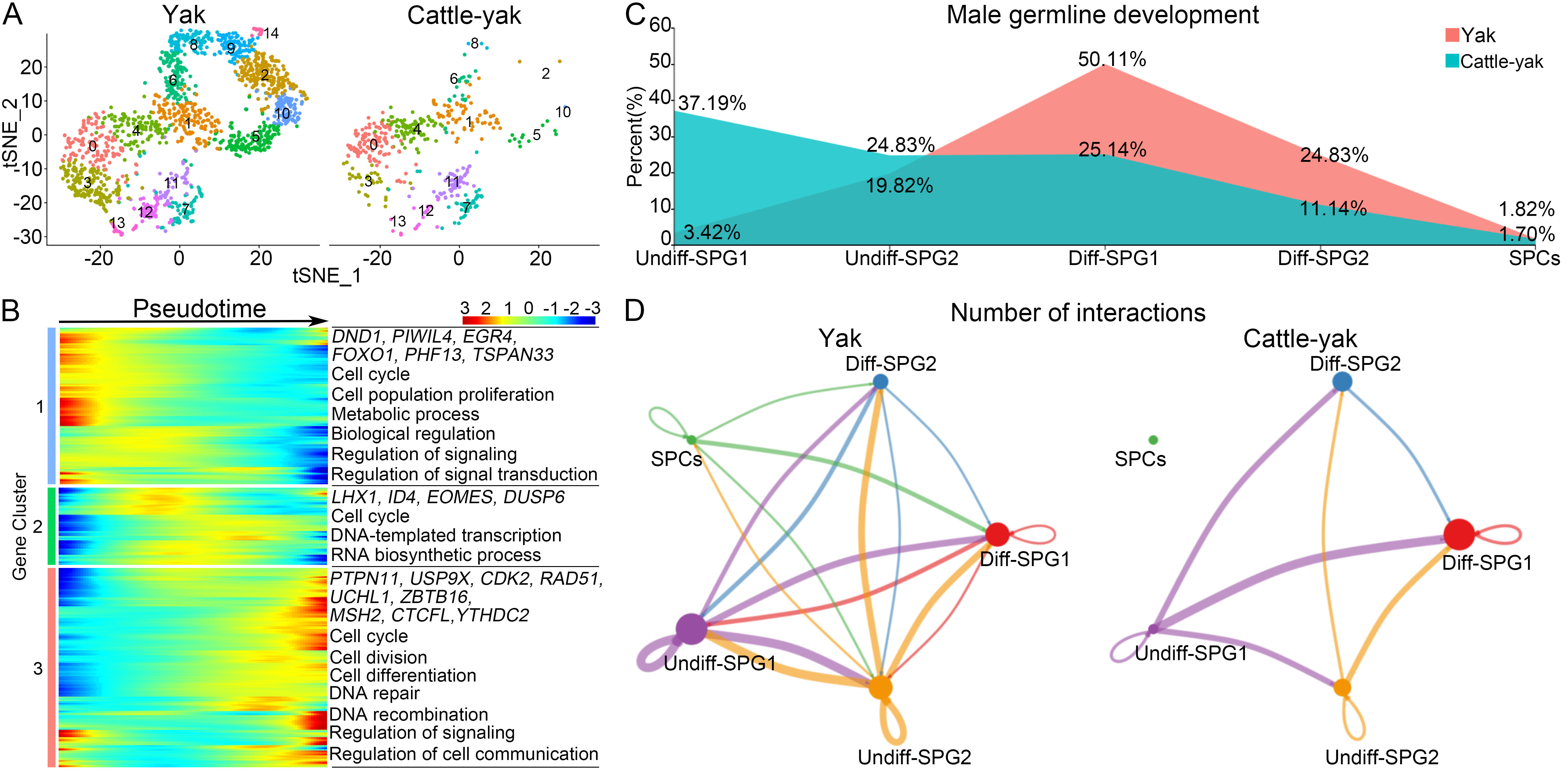 单细胞转录组分析揭示犏牛精原细胞命运决定异常。A:牦牛和犏牛生殖细胞单细胞tSNE聚类图;B:随拟时序变化的不同类型生殖细胞基因表达特征分析;C:两种牛精原细胞和早期精母细胞比例;D:细胞通讯分析显示两种牛不同类型精原细胞互作存在显著差异。未分化型精原细胞1(Undiff-SPG1)、未分化型精原细胞2(Undiff-SPG2)、分化型精原细胞1(Diff-SPG1)、分化型精原细胞2(Diff-SPG2)和精母细胞(SPCs)