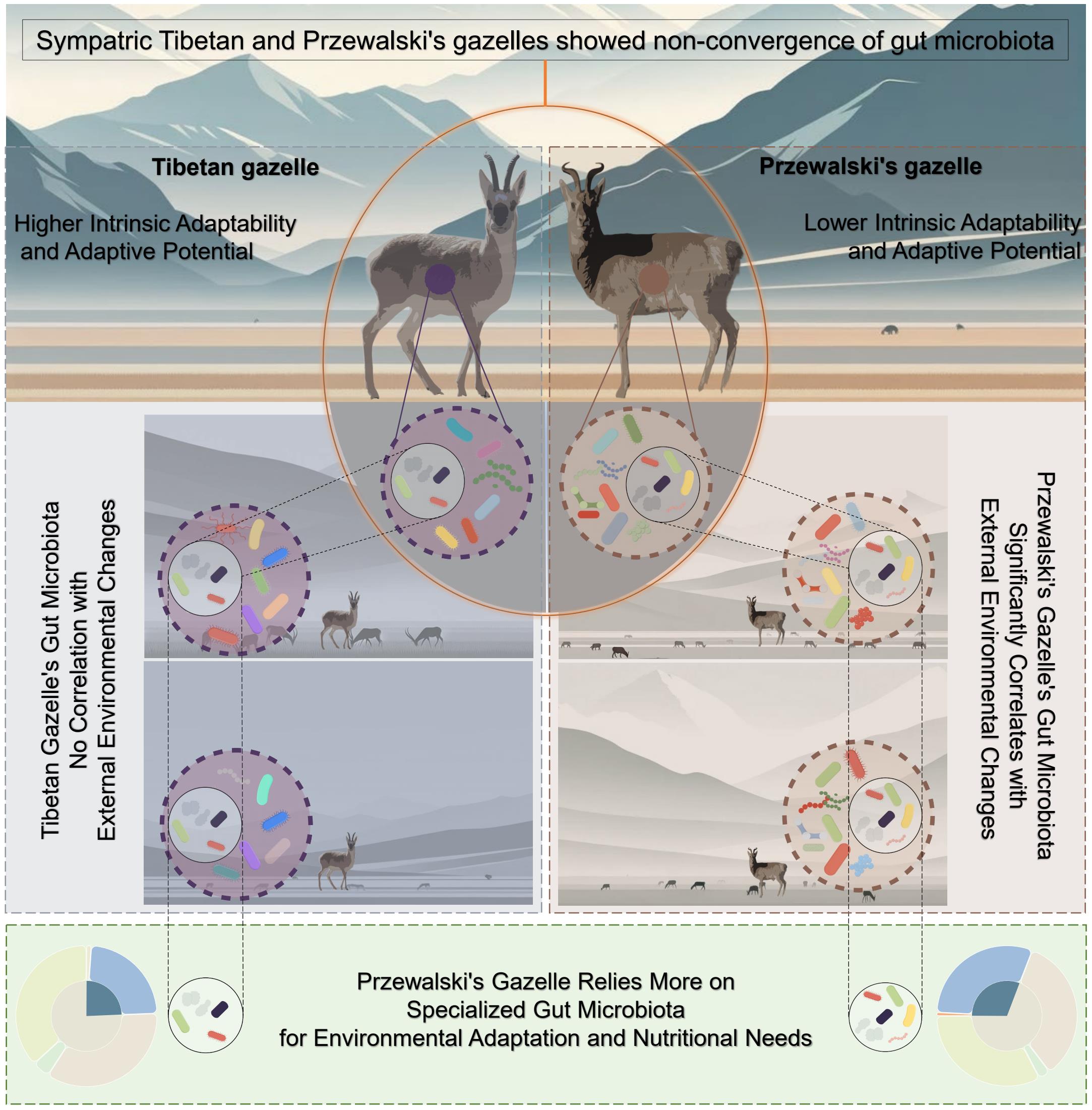 为阐明宿主濒危程度与肠道微生物依赖性之间的关系,中国科学院西北高原生物研究所动物生态与资源保护研究团队以藏原羚(近危)和普氏原羚(濒危)为研究对象,通过16S rRNA扩增子测序技术进行高通量测序,深入探究了这两个物种在相同和不同环境条件下的肠道微生物多样性和组成,群落组装机制以及预测功能的变化。研究结果表明,相较于异域分布的种群,同域分布的藏原羚和普氏原羚种群的肠道微生物多样性和组成并未因共享相同环境而呈现显著的趋同。进一步分析发现,藏原羚和普氏原羚肠道微生物与宿主外部环境变化的关系存在明显的区别,濒危等级更高的普氏原羚肠道微生物群落结构变异与环境条件的改变显著相关,而在濒危等级较低的藏原羚中,这种相关性则不显著。利用iCAMP对两物种肠道微生物群落的组装过程进行定量分析,结果显示普氏原羚肠道微生物群落的组装过程相比藏原羚更偏向于同质选择过程(HoS)。对促进这一转变的微生物类群进行分析,发现在普氏原羚中贡献了同质选择,但在藏原羚中贡献了其他过程(如随机漂变、扩散限制、异质分散或异质选择)的ASVs主要隶属于颤螺旋菌科、coprostanoligenes group、克里斯滕森菌科、阿克曼氏菌科和拉克诺斯菌科。对这些ASVs进行功能预测及KEGG富集分析,结果表明,其主要与营养物质代谢、合成以及免疫调节密切相关,提示这些ASVs可能在宿主营养物质利用和免疫功能维持等方面发挥着重要作用。研究认为濒危等级较高的普氏原羚更依赖肠道微生物所提供的“生态系统服务”以应对环境的变化。这种依赖性可能源于濒危物种通常适应性和适应潜力较低,肠道微生物在其适应和应对环境变化中发挥了重要的补偿作用。本研究在揭示宿主濒危程度与肠道微生物依赖性的关系的同时,也为濒危物种保护和管理提供了新的视角和策略。