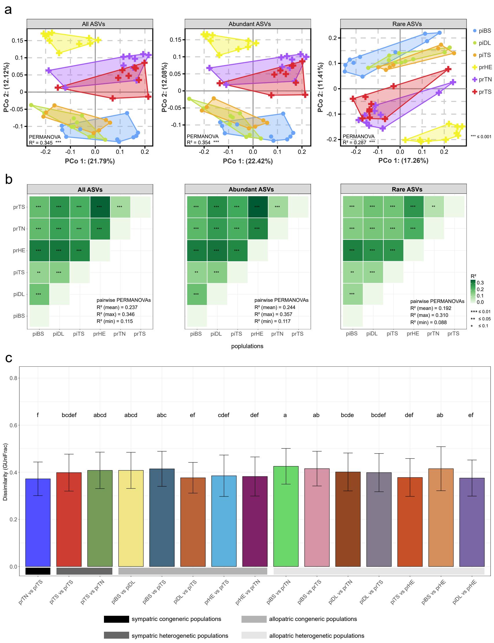 同域分布着的原羚种群相较于异域分布着的种群其肠道微生物未发现显著的趋同(a)基于GUniFrac距离的藏原羚和普氏原羚不同种群肠道微生物PCoA分析;(b)藏原羚和普氏原羚种群肠道微生物β-多样性组间差异热图;(c)藏原羚和普氏原羚同域、异域分布种群肠道微生物相异性条形图