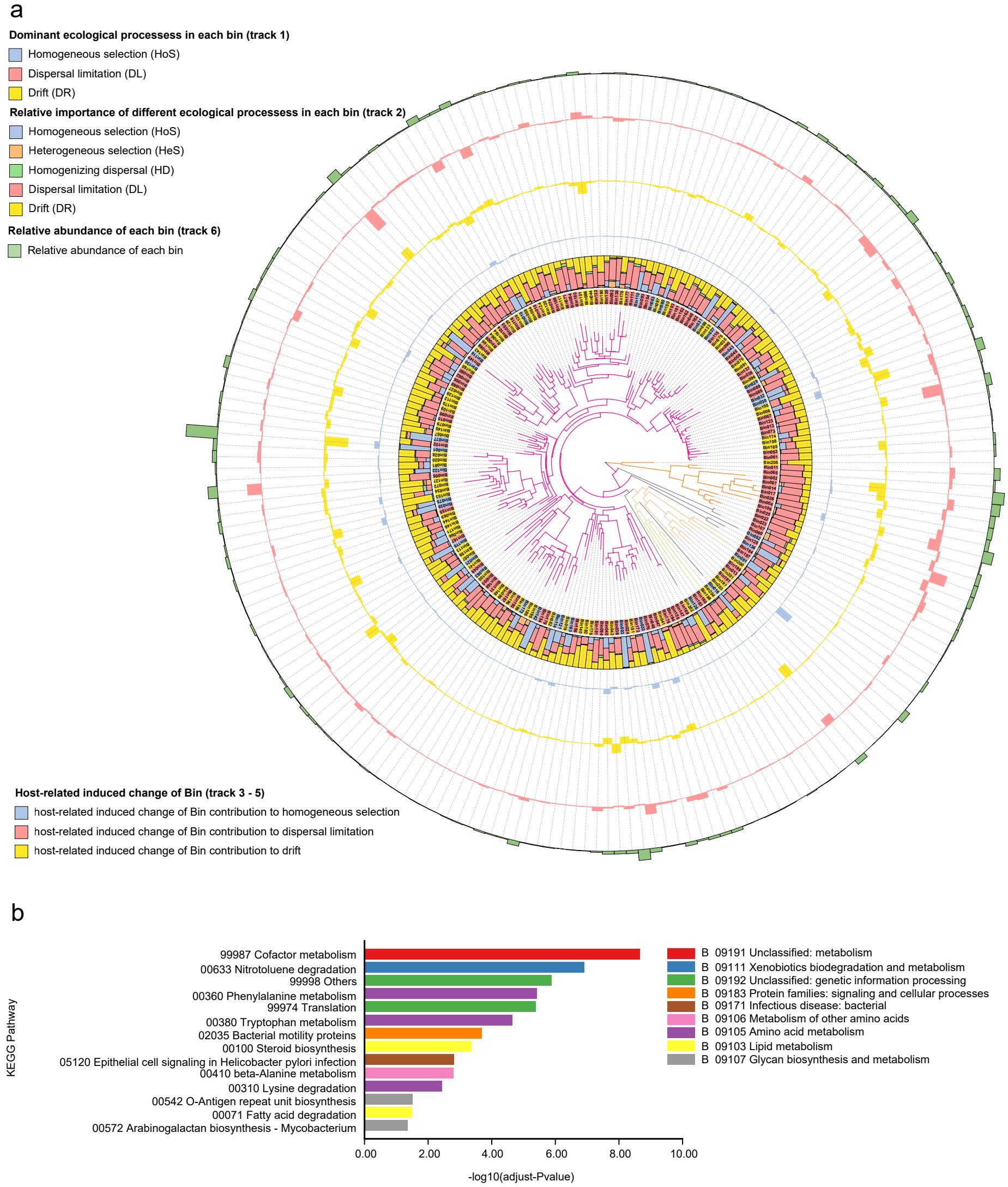 藏原羚和普氏原羚肠道微生物不同系统发育分箱的生态学组装过程(a)及在普氏原羚肠道微生物中贡献了同质选择过程而在藏原羚中却贡献了其他生态学组装过程的ASVs集合所进行的KEGG富集分析(b)