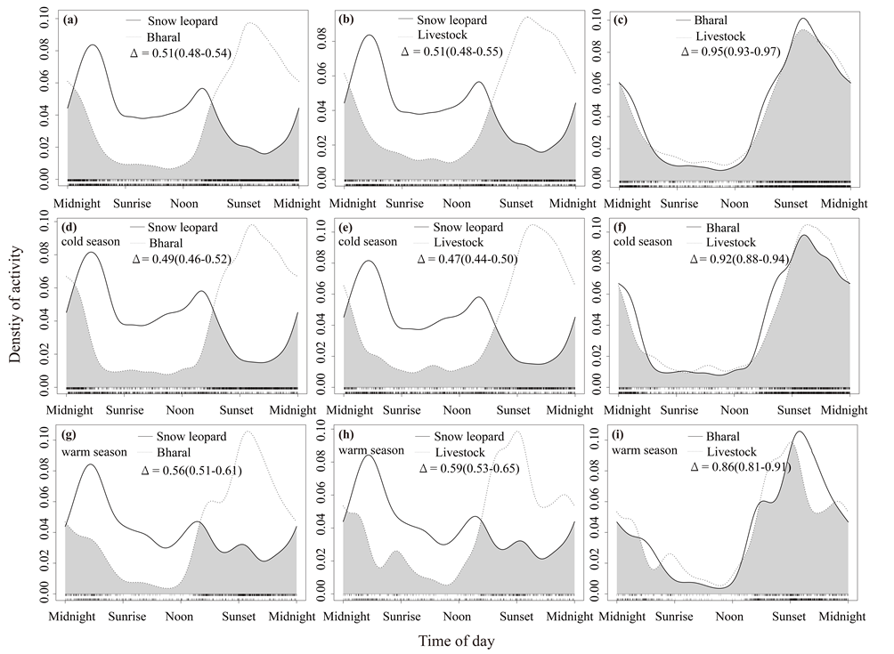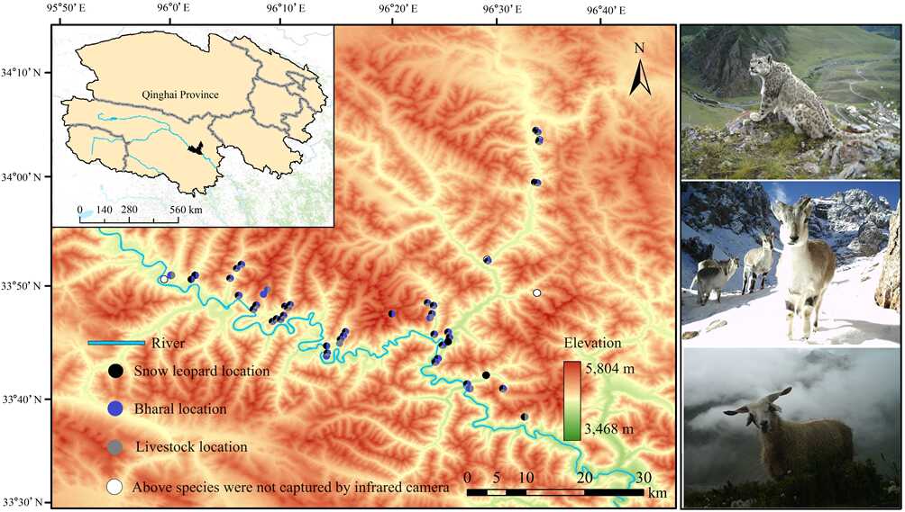 中国科学院西北高原生物研究所动物生态与资源保护研究团队以人兽冲突较为严重的曲麻莱县巴干乡为研究地区,利用调查问卷评估了当地牧民对雪豹袭击家畜事件的态度,并结合红外相机陷阱技术获得了雪豹和其主要猎物岩羊(Pseudois nayaur)以及散养家畜的影像资料,进而探讨了三种(类)动物的时空重叠。研究结果表明: (1)雪豹主要在夜间捕食家畜,牧民因雪豹袭击家畜事件的发生而对雪豹保护持消极态度;(2)岩羊和家畜的空间利用重叠度最高(OI = 0.78),其次是雪豹和岩羊(OI = 0.75)以及雪豹和家畜(OI = 0.75);(3)雪豹属于典型的夜行性动物,而岩羊和家畜以昼间活动为主。岩羊和家畜的日活动节律模式高度一致,时间重叠指数最高(D = 0.95),而雪豹和岩羊、雪豹和家畜的日活动节律重叠指数较低(D = 0.51),且重叠时段主要集中于夜间。综上所述,由于雪豹、岩羊和散养家畜之间存在较高的空间重叠,可能增加了家畜被雪豹捕食的机会,同时,家畜和岩羊活动节律的高度重叠进一步加剧了此类事件的发生几率。基于研究结果,我们提出了针对性的保护和管理措施,例如规范放牧区域以减小家畜与雪豹的相遇几率,加强对散养家畜的夜间管理以减少雪豹夜间肇事等。