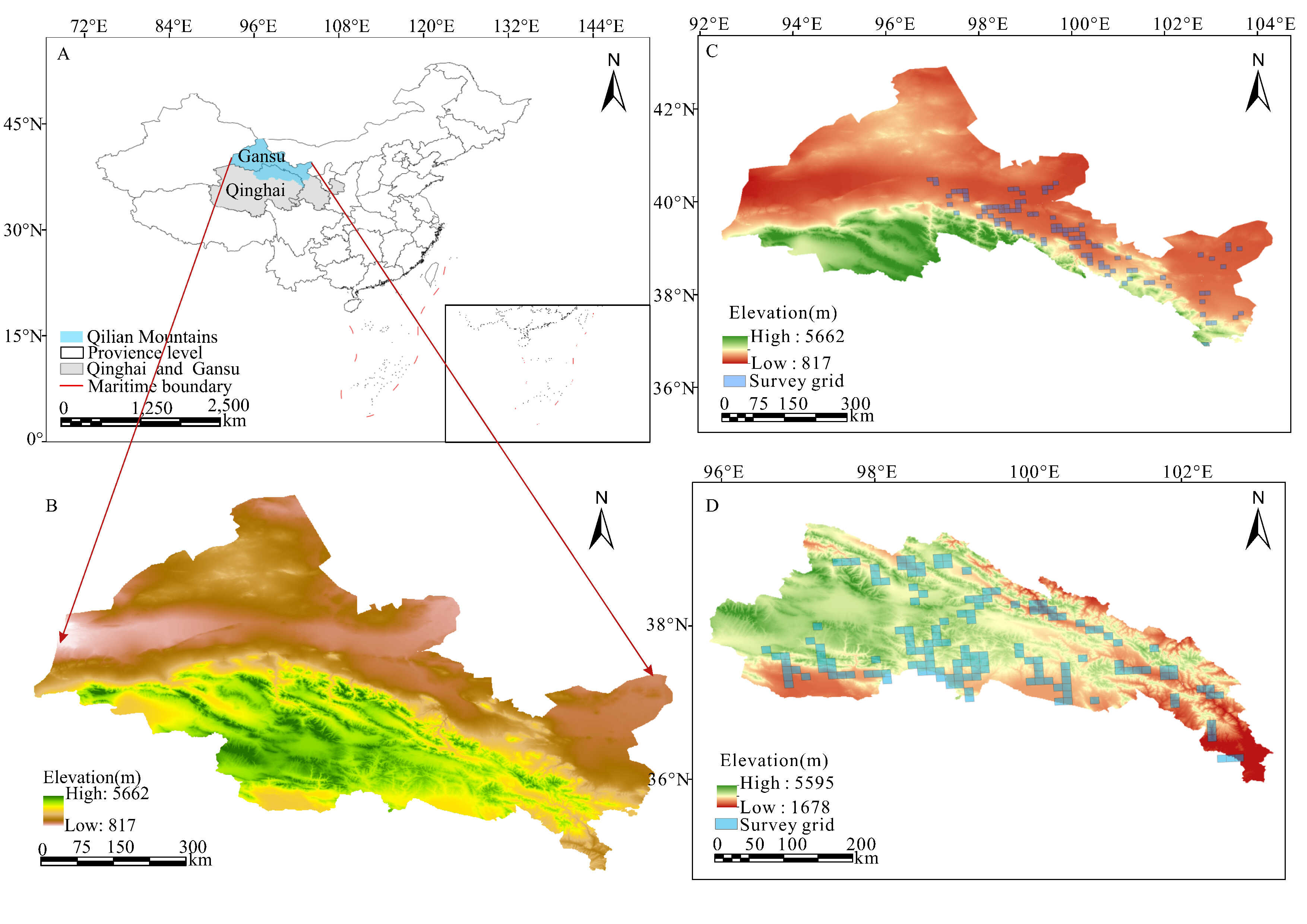 研究区域分布图。(A)祁连山位置;(B) 祁连山海拔分布变化;(C) NSQM中鸟类调查网格海拔分布变化;(D) SSQM