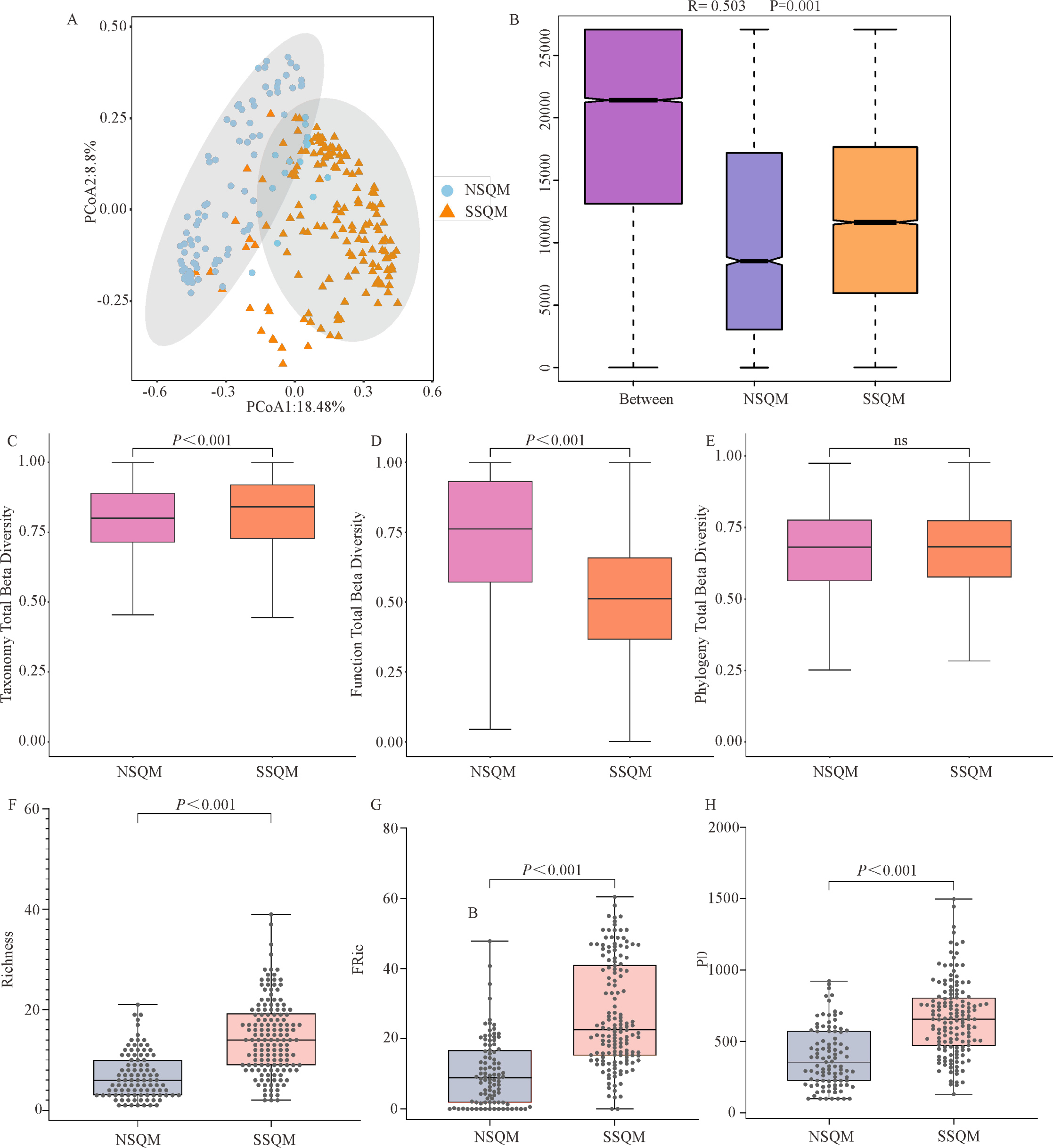 祁连山南北坡鸟类群落多样性格局。(A) NSQM和SSQM中鸟类β多样性的主坐标分析(PCoA);(B) NSQM和SSQM中鸟类群落的相似性(ANOSIM);(C, D, E) NSQM和SSQM中鸟类群落分类, 功能, 系统发育总β多样性;(F, G, H) NSQM和SSQM中鸟类群落Richness指数, FRic和PD指数