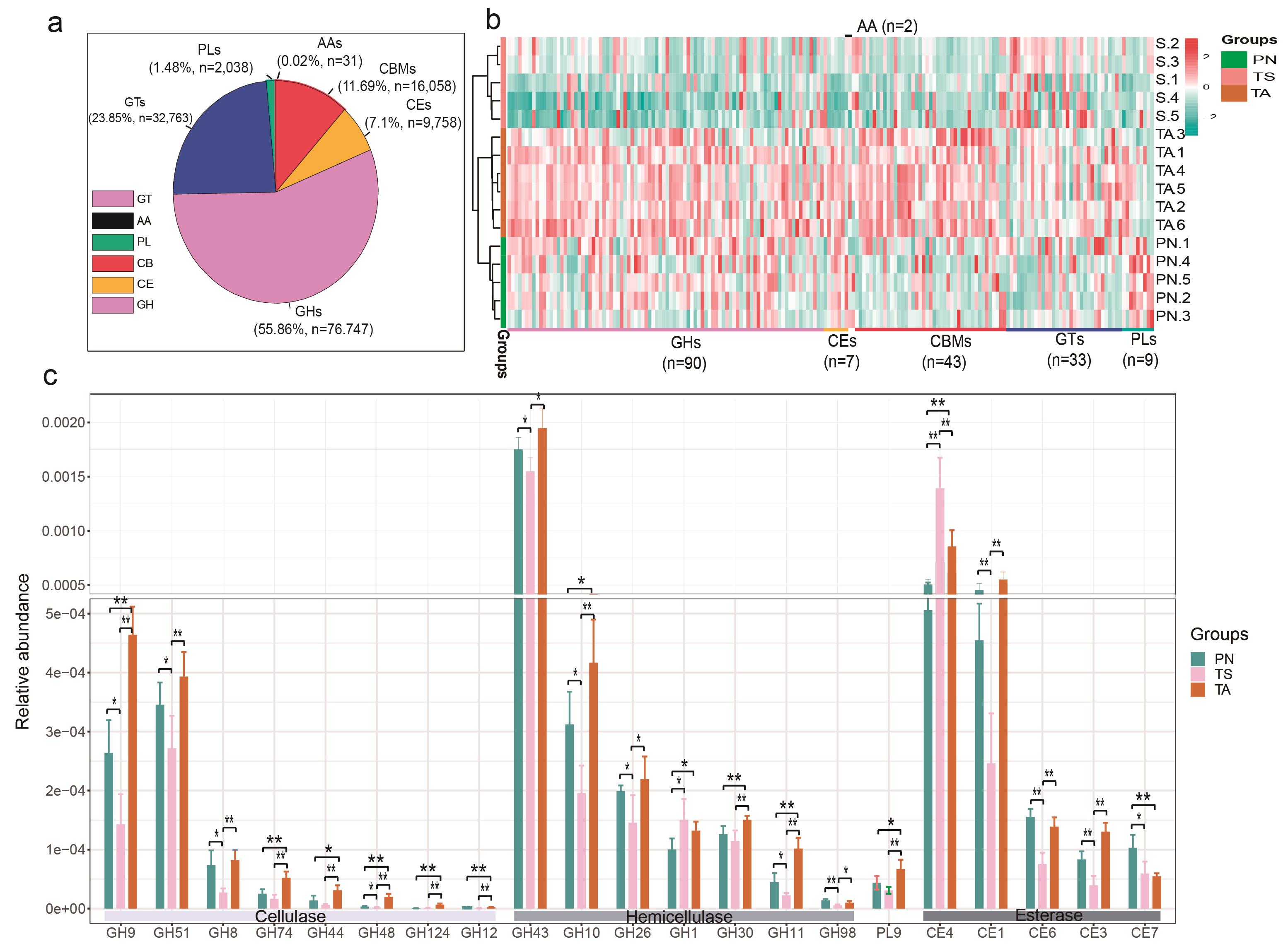 不同小反刍动物CAZYme酶基因分布特征。(a) unigenens 整体分布状况;(b)糖苷水解酶(GHs)、糖基转移酶(GTs)、多糖裂解酶(PLs)、碳水化合物酯酶(CEs)及碳水化合物结合模块(CBMs)富集分析;(c)不同小反刍动物肠道菌群有关纤维素酶、半纤维素酶及酯酶基因显著性分析