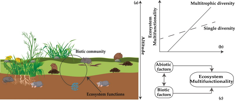 概念框架:(a) 生物群落由三个营养级组成—植物、啮齿动物和微生物;(b) 多营养级多样性能够增强生态系统多功能性;(c) 生物因子和非生物因子对生态系统多功能性具有直接和间接影响
