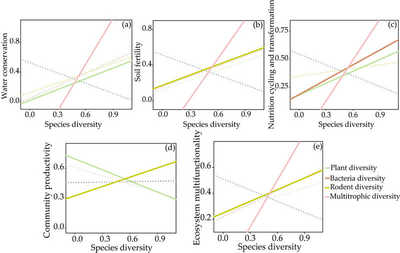 不同营养级物种多样性对生态系统功能的影响:(a) 水分保持;(b) 土壤肥力;(c) 养分循环与转化;(d) 群落生产力;(e) 生态系统多功能性。实线表示显著关系,虚线表示无显著关系