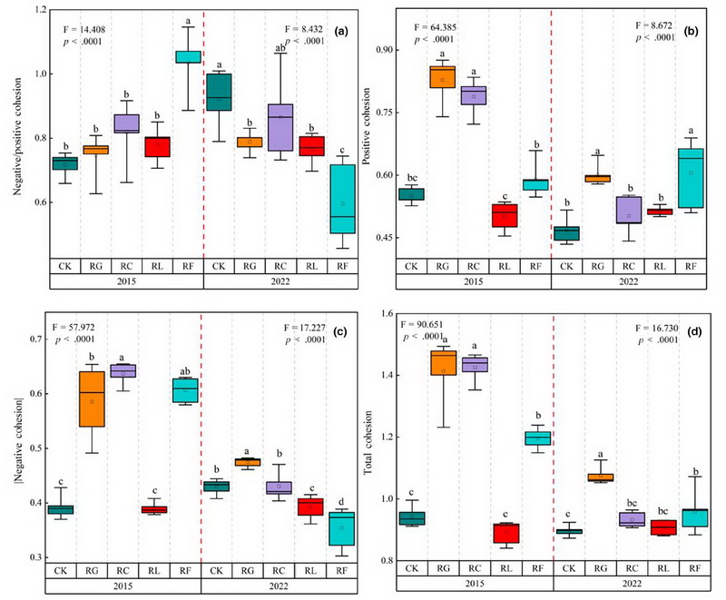 不同时间段下植物功能群去除后群落中负内聚力与正内聚力情况