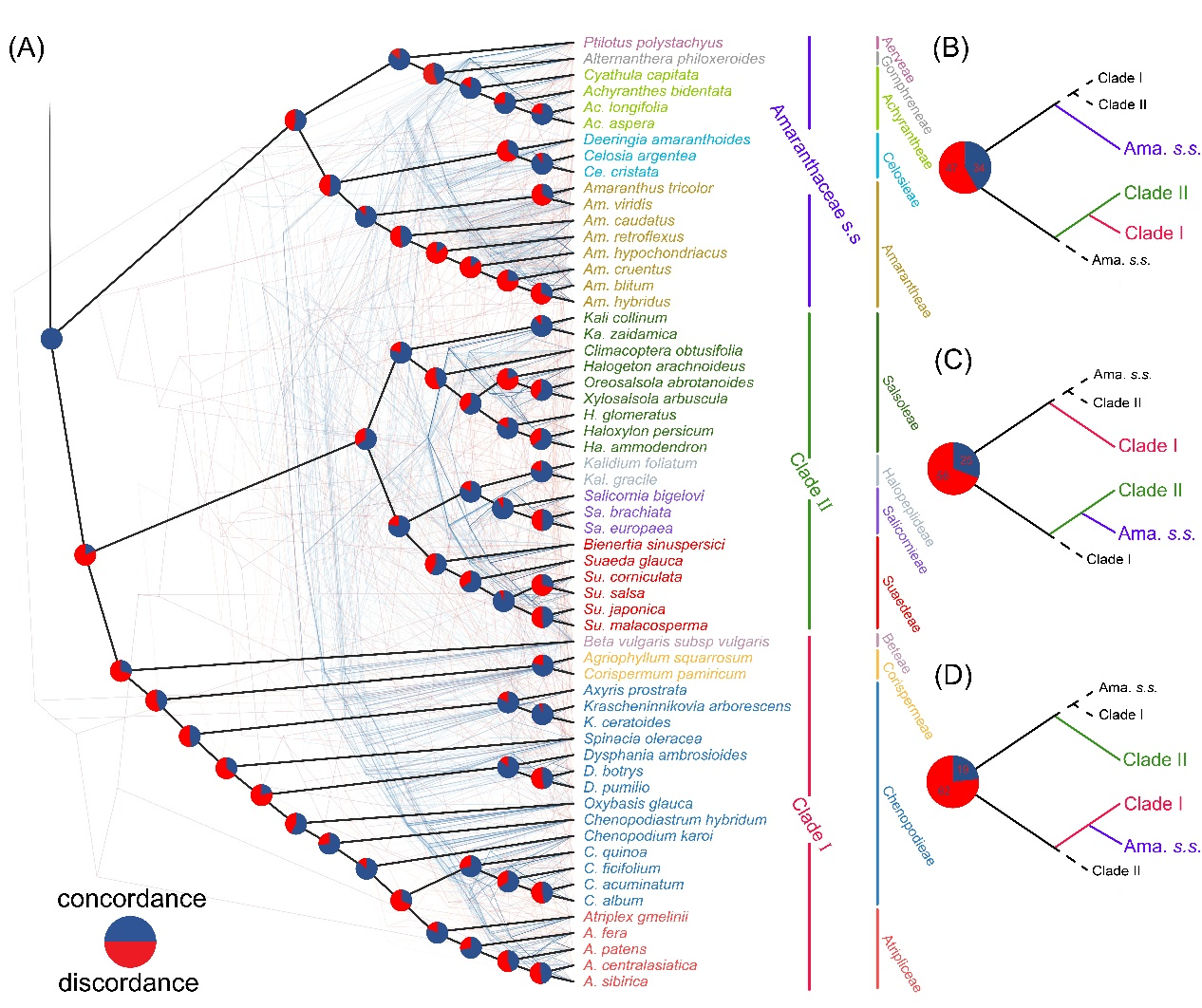 广义苋科(Amaranthaceae s.l.)隶属于石竹目(Caryophyllales),包含传统藜科(traditional Chenopodiaceae)和狭义苋科(Amaranthaceae s.s.),涵盖170余属2000多种植物。该科植物具有重要的经济和生态价值,如藜麦(Chenopodium quinoa)、菠菜(Spinacia oleracea)和甜菜(Beta vulgaris)等作物为人类提供了丰富的营养和蛋白质来源。此外,许多物种在干旱和盐碱环境中表现出极强的适应性,成为耐盐作物研究的重要对象。然而,广义苋科在系统分类和进化关系上仍存在诸多问题。由于物种间形态相似性和不完全谱系分选(ILS)事件,传统藜科与狭义苋科的系统发育关系尚未完全解析,特别是甜菜亚科(Betoideae)的分类地位仍存争议导致传统藜科成为非单系类群,因此APG Ⅳ系统将其与狭义苋科合并成为广义苋科,藜科的命名被废除。鉴于广义苋科在当前系统学研究中存在多种问题,亟需利用可靠的分子标记重建其系统发育关系。