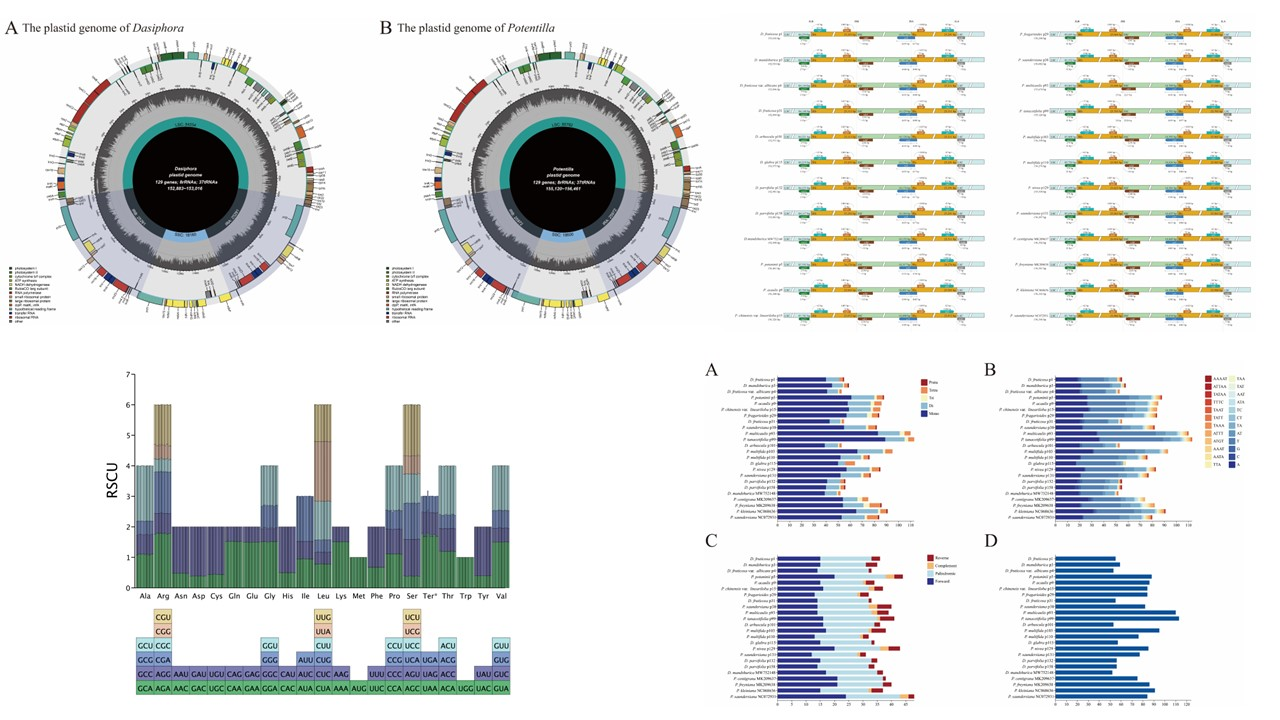 研究结果以“Comparative and phylogenetic analysis of Potentilla and Dasiphora (Rosaceae) based on plastid genome”为题,于2025年2月10日在BMC Plant Biology(中国科学院二区Top,IF=4.3)发表。西北高原所硕士研究生李孝平为第一作者,西北高原所张发起研究员为通讯作者。该工作得到了第二次青藏高原综合科学考察研究、青海省重大科技专项、中国科学院战略生物资源计划、中国科学院-青海省三江源国家公园联合研究专项和中国科学院“西部之光”人才培养计划等项目资助。