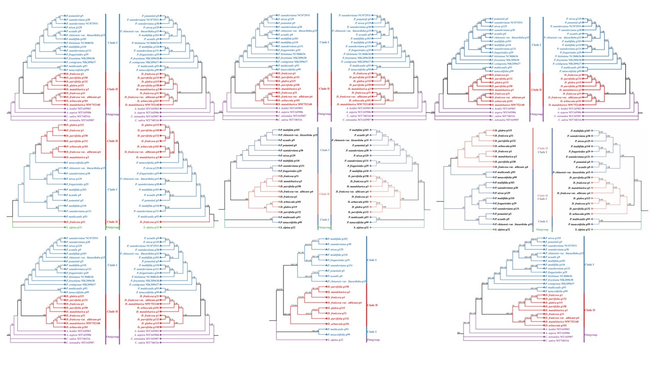 中国科学院西北高原生物研究所青藏高原植物适应与进化研究团队选择了19个委陵菜属和金露梅属的全质体基因组进行Illumina二代测序,重建了该类群的系统发育关系,并研究了他们之间的核质冲突关系。研究结果表明,这些质体基因组的结构、GC含量和基因组成都高度保守,包含84个CDS、37个tRNA基因和8个rRNA基因。此外,所有金露梅属质体基因组的rpl2失去了唯一的内含子。比较基因组分析结果表明,质体大小的差异归因于LSC区、SSC区和IRS区的长度差异,并且IR区大部分是保守的,非编码区比编码区具有更高的差异性。我们筛选了SSR,发现了7个高度可变位点,可作为潜在的分子标记,在阐明委陵菜属和金露梅属的属间关系上具有一定的参考意义。通过核基因(ITS、ETS)和细胞质基因(质体、线粒体)构建的系统发育树,确定了委陵菜属和金露梅属的单系性。我们在委陵菜属中检测到了核质冲突,这种冲突往往会导致其单系性发生变化,我们推测可能在其进化过程中发生了一定程度的种间杂交或不完整谱系分选事件。本研究通过对委陵菜属和金露梅属的系统发育比较分析,为该类群之间的分类学研究奠定基础。