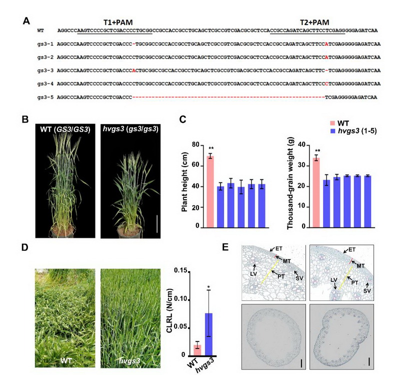 Gγ亚基在多种生物过程中发挥着重要作用,但其在大麦中的具体功能尚未完全明确。为了深入研究这一问题,中国科学院西北高原生物研究所高原作物种质资源创新与利用研究团队利用CRISPR/Cas9技术敲除大麦品种Golden Promise中的HvGS3基因,并通过详细的表型分析比较了突变体hvgs3与野生型之间的株高、穗长和千粒重等农艺性状。结果显示,突变体hvgs3的株高比野生型降低了37.8%至43.1%,同时倒二节的抗倒伏指数提高了76.6%。进一步分析发现,突变体hvgs3的茎节细胞长度显著缩短,导致株高降低。突变体hvgs3的木质素合成通路被激活,木质素含量比野生型增加了22%,基部第二节间的维管束数量、机械组织厚度均高于野生型,从而增强了茎秆的机械强度。通过CRISPR/Cas9技术成功敲除HvGS3基因,我们创制了一种具有矮化和抗倒伏特性的大麦新种质资源,株高的降低和茎秆强度的增加共同提升了其抗倒伏性能。该研究不仅揭示了大麦HvGS3基因的功能,还为培育抗倒伏、高产的大麦品种提供了宝贵的理论依据和技术支持。