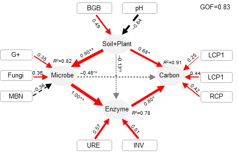 高寒草甸土壤有机碳变化与生产力、微生物及酶活性的关联模型