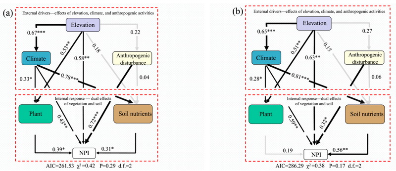 图2 海拔、气候、植被、土壤养分及人为干扰因子对综合污染指数的影响