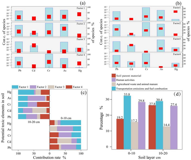 图3 不同土层中基于 PMF 模型解析的潜在毒性元素(PTEs)源谱及相对贡献占比:(a) 0~10 cm 土层、(b) 10~20 cm 土层