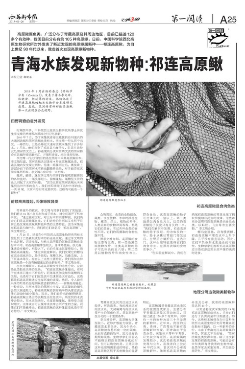 2015年1月出版的杂志《动物学分类(Zootaxa)》,发表了署名李文靖、陈晓澄、胡延萍的论文。他们记述了祁连高原鳅的相关生物学分类及研究成果。至此,黑河特有种祁连高原鳅第一次出现在公众视野。