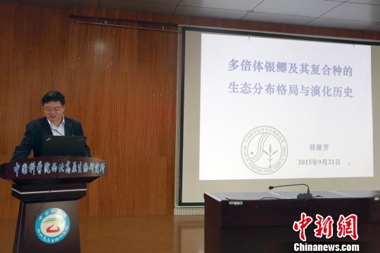图为中国科学院水生生物研究所研究员桂建芳作《多倍体银鲫及其复合种的生态分布格局与演化历史》报告。 罗云鹏 摄