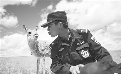 | 可可西里索南达杰保护站协警解安程在站内救护中心陪小藏羚羊玩耍。 新华社记者 张宏祥摄 |