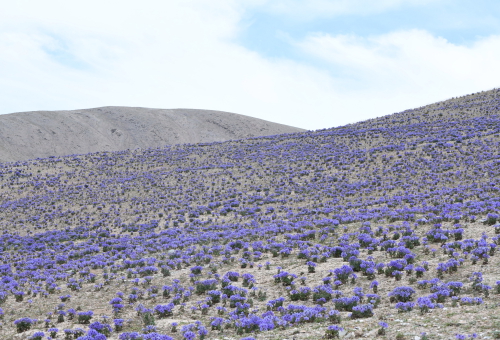 近日,记者从中国科学院西北高原生物研究所获悉,该所科研团队于本年度植物多样性和藏药材资源调查过程中,新发现白蓝翠雀花分布的新形式——蔚为壮观的白蓝翠雀花(Delphinium albocoeruleum)群落,其以带状分布于青海海西蒙古族藏族自治州德令哈市辖高寒荒漠区,分布平均海拔4300米,分布面积约5000公顷。大规模白蓝翠雀花群落的发现,对于研究该物种的群落演变与消长、藏药材资源的开发与利用乃至高寒荒漠区生态系统发展极具重要意义。