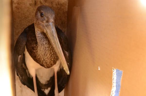原来,这只黑鹳疑似受到惊吓后撞墙跌落村民家中。中心工作人员随即对黑鹳全面检查,检查后未发现明显外伤,颈椎、翅膀、腿部无骨折,口、鼻、眼无分泌物无出血,肛门周边无排泄物污染,营养状况良好,体温正常。