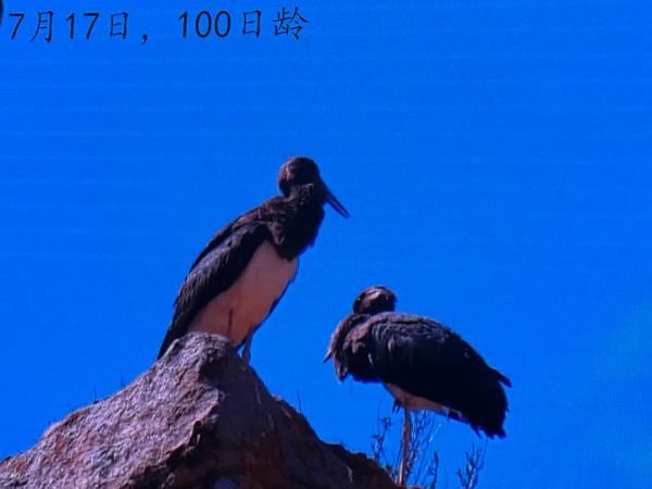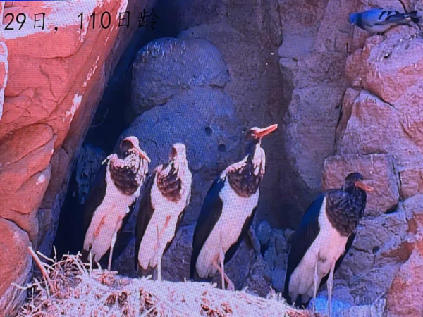 从此,协会工作人员开启了对两只黑鹳的日常监测。3月底,两只黑鹳开始产卵、孵化,经过一个月多的孵化,5月初成功孵化4只黑鹳幼鸟。幼鸟在近100日龄时,开始飞出巢穴,练习飞行。8月29日,黑鹳幼鸟分别离巢,随亲鸟一同前往觅食地。