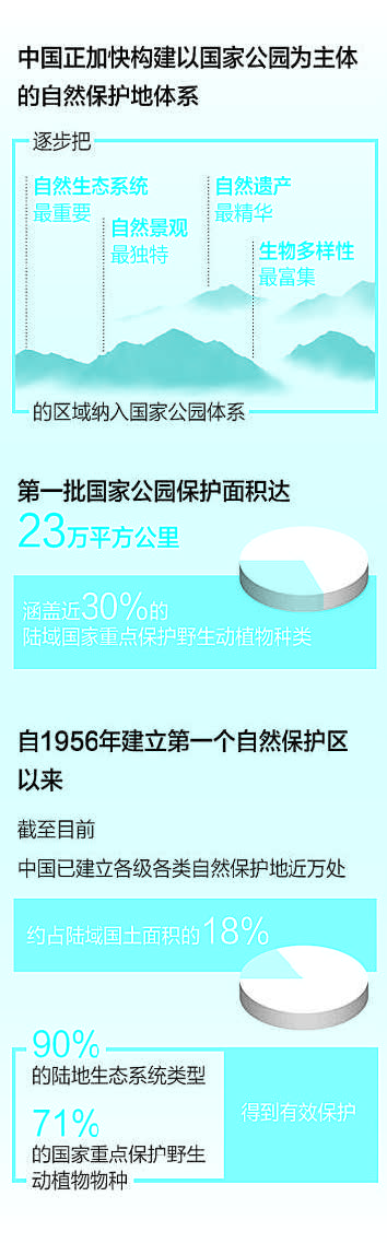 2021年10月,我国正式设立三江源、大熊猫、东北虎豹、海南热带雨林、武夷山等第一批国家公园,涉及青海、四川、海南等10个省份。第一批国家公园保护面积达23万平方公里,涵盖近30%的陆域国家重点保护野生动植物种类,实现了重要生态区域的整体保护,涵盖了所在区域典型自然生态系统以及珍贵的自然景观和文化遗产,保护了最具影响力的旗舰物种。