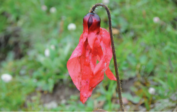 红花绿绒蒿是一种花色艳丽且形态别致的珍稀植物。红花绿绒蒿花葶从莲座叶丛中生出,花单生于基生花葶上,微微下垂,花瓣呈现出炫目的红色丝绸般的光泽。第一次遇到红花绿绒蒿时,许多人都会不由自主地神迷于那一抹娇羞醒目的红色。张发起介绍,红花绿绒蒿也是青藏高原上著名的观赏花卉之一。