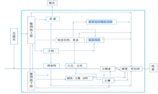 分解者亚系统:进行了土壤微生物种类的调查,植物立枯和凋落物的分解速率、各类微生物的活性与环境的关系等方面的研究。