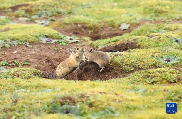 两只高原鼠兔在西藏思金拉错湖边嬉戏。新华社记者 周锦帅 摄