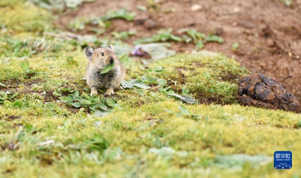 一只高原鼠兔在西藏思金拉错湖边进食。新华社记者 周锦帅 摄