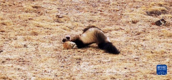 这是西藏那曲班戈县拍摄的一只艾鼬捕食鼠兔的场景(2022年4月13日摄)。新华社记者 沈虹冰 摄