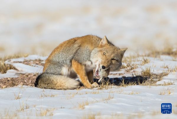 一只藏狐在可可西里五道梁附近捕食鼠兔(2019年12月25日摄)。新华社发(孙洪 摄)
