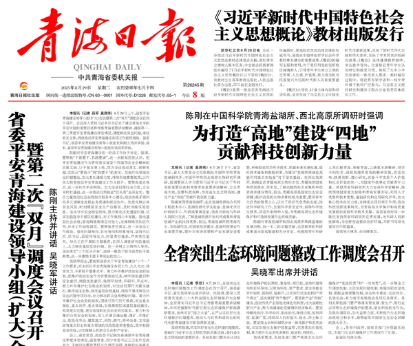 本报讯 (记者 莫昌伟) 8月28日下午,省委书记、省人大常委会主任陈刚赴中国科学院青海盐湖研究所、中国科学院西北高原生物研究所调研,强调要深入学习贯彻习近平总书记关于科技创新重要论述和考察青海重要讲话精神,立足青海大地,登攀科技高峰,为打造生态文明高地,建设产业“四地”贡献科技创新力量。
