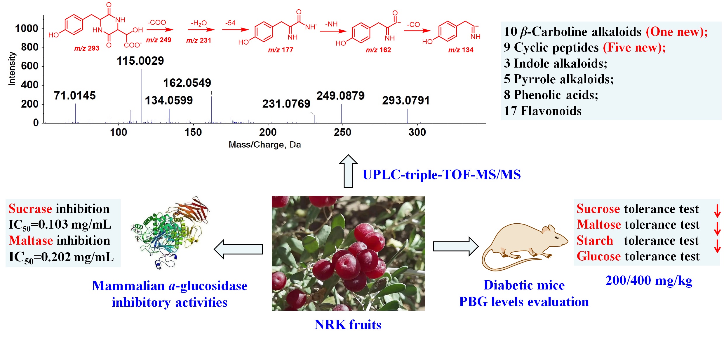 经过精密的实验和分析,科研团队成功鉴定出一个新的β-carboline类生物碱和五个新环肽类生物碱。这一发现不仅丰富了大果白刺的化学成分库,更为后续的药理活性研究提供了重要的物质基础。更值得一提的是,科研团队还首次揭示了环肽类生物碱的质谱裂解规律,为大果白刺中环肽类生物碱的快速鉴定和纯化分离提供了理论依据。