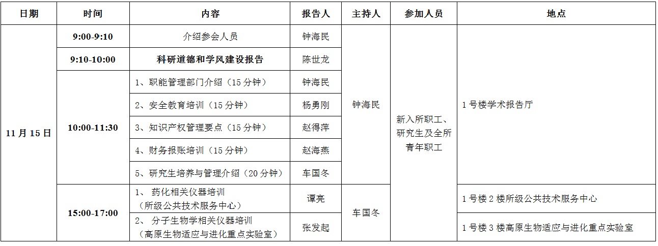为使新职工和研究生更加熟悉研究所科研及管理情况,更好的开展工作、完成学习任务,定于11月15日举行新进职工和研究生入所教育和培训。具体安排如下: