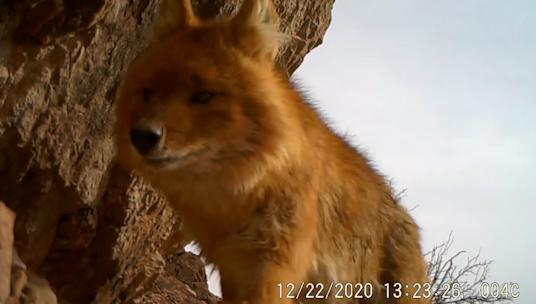 这组影像由青海格尔木的蒙古族摄影师巴特,利用红外相机在昆仑山深处拍摄。从影像资料中可以看到,豺的毛色光亮整齐,这反映出来它的身体状况非常好,画面中的豺对红外相机非常感兴趣,并把相机当成了它的玩具,留下了一张萌萌的自拍照。