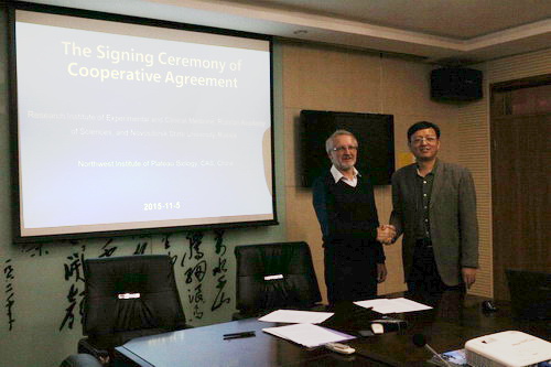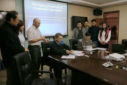 11月5日,应中国科学院西北高原生物研究所(以下简称西北高原所)动物与病原体协同进化-生态-行为与免疫学科组副研究员李来兴邀请,俄罗斯科学院试验及临床研究所研究员Alexander Shestopalov,俄罗斯科学院西伯利亚分院动物生态及系统研究所研究员Yurlov Alexandr及其相关科学家一行4人来访西北高原所,并代表俄罗斯科学院试验及临床研究所和俄罗斯科学院西伯利亚分院动物生态及系统研究所与西北高原所签定了《关于进行人畜共患病毒性病原体的进化与生态学研究的合作协议》,协议主旨是对协议双方在科研、教育和相应的对威胁到人类和饲养动物方面的病毒性病原体的进化和生态学合作研究提供组织保证和支撑。签约仪式由西北高原所副所长陈世龙主持。