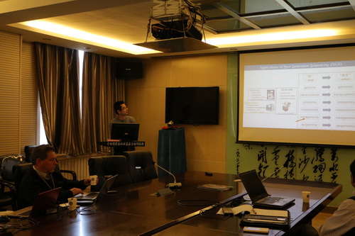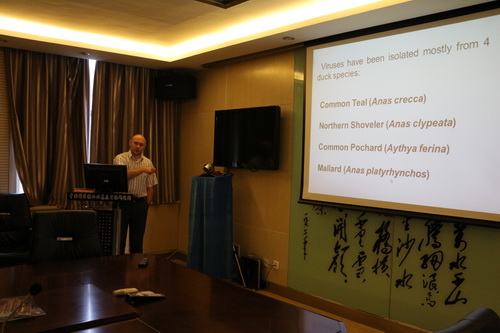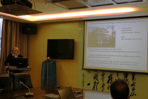 11月6日,俄罗斯来访科学家还与西北高原所相关科研人员进行了学术交流。 Alexander Shestopalov做了题为Results of China-Russian scientific Collaboration的报告。Yurlov Alexandr做了题为Water birds of the south of West Siberia: breeding, migration and conservation的报告。Sharshov Kirill做了题为Avian Influenza Surveillance and Bird Ecology in Central Asia (Russia, Northern China)的报告。Kurskaya Olga做了题为Anti-Influenza Activity of Plant Extracts-collaboration results的报告。西北高原所助理研究员张瑞娜做了题为Interspecies germ cell transplantation: can we use it to increase the reproductive efficiency of bar-head goose的报告。动物与病原体协同进化-生态-行为与免疫学科组博士生王稳,硕士研究生曹建分别做了题为Metagenomic Study on Characteristic Birds in Qinghai - Tibetan Plateau和Lysozyme concentration in related to breeding density, laying order and Maternal Antibody of Newcastle Disease Virus in the Egg of Great Cormorant (Phalacrocorax Carbo)的报告。