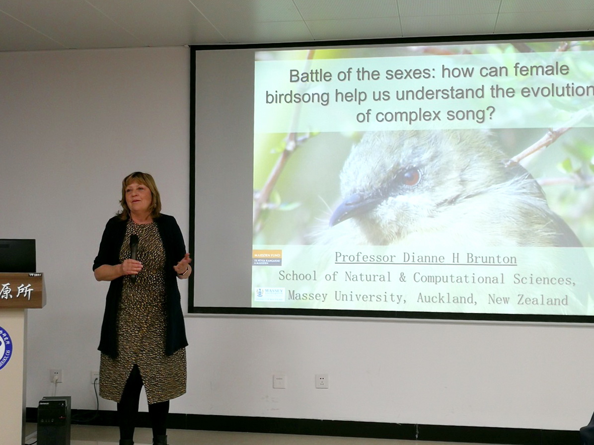 接着, Dianne Brunton 进行了题为 Battle of the sexes: how can female birdsong help us understand the evolution of complex song 的精彩报告,报告主要从对鸟类鸣声进化所做的研究,雌鸟的鸣声进化意义,并探索雌鸟鸣声进化的选择性驱动因素以及雄性和雌性鸣叫的选择机制有无可比性?为了产生复杂的歌声,雌性是否进化出了与雄性相似的形态等方面进行讲解。