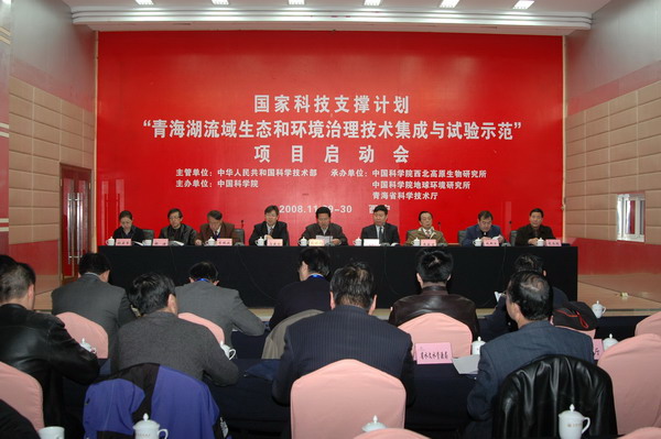 2008年11月29日至29-30日, 由著名地球环境学家、中国科学院院士安芷生院士领衔的“十一五”国家科技支撑计划重点项目“青海湖流域生态和环境治理技术集成与试验示范(2007BAC30B00)”启动会在青海西宁召开。青海省人民政府高云龙副省长、科技部社会发展司马燕合司长、中国科学院资环局傅伯杰局长、中国工程院李佩成院士、中国科学院安芷生院士、青海省科技厅解源厅长、中国科学院西北高原生物所赵新全所长、青海省气象局张蓝青副局长、海北州人民政府党永魁副州长出席会议并在主席台就坐。青海省科技厅、青海省农牧厅、青海省环保局、青海省林业局、青海省气象局、青海湖景区保护利用管理局、青海省水文水资源局、青海省草原总站和海北州人民政府、海南州人民政府等部门和单位的领导和专家,以及各课题承担单位中国科学院地球环境研究所、中国科学院西北高原生物研究所、北京师范大学、青海省畜牧兽医科学院、青海省农林科学院、青海省气象科学研究所等100余名研究和管理人员出席了会议。会议由中国科学院主办,中国科学院西北高原生物研究所、中国科学院地球环境研究所和青海省科技厅承办。