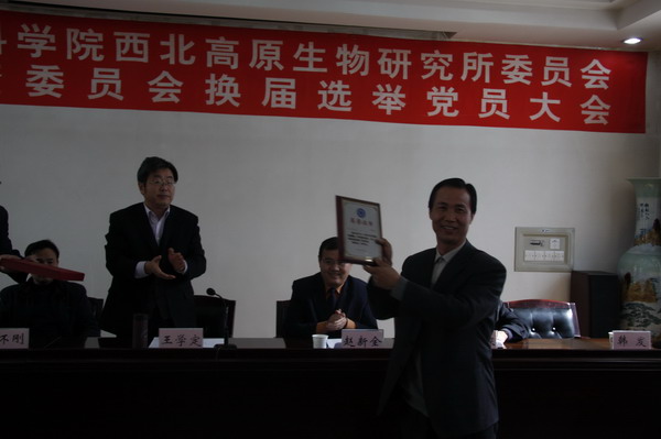 王学定书记在会上代表院党组宣布了《关于西北高原生物所第十届党委和第七届纪委选举结果的批复》,对上届党政班子为西高所的创新发展做出的成绩给予了充分的肯定,并对新一届党政班子提出了更高的要求。要求新党委成员要带领西高所党员认真学习胡锦涛总书记在十七届三中全会上的讲话,促进全体党员对党的认识,不断加强党性修养,树立优良作风,不断增强研究所的凝聚力和战斗力。他还特别强调领导要做遵纪守法的模范,在思想上要与中央、省委、院党组保持高度一致;要进一步加强党的工作和创新文化的融合;要建设和谐研究所,党的工作必须要创新、细致地去开展;要进一步抓紧人才引进、成果转化等方面的工作。他祝愿西高所在新党政班子的带领下有更大的创新和发展。最后代表兰州分院党组给西高所卸任的党委副书记韩发同志颁发了荣誉证书。