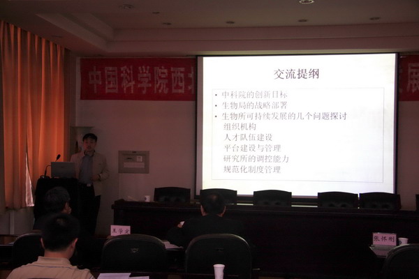 开幕式由赵新全书记主持,兰州分院王学定书记作了重要讲话,并主持了上半时的报告会。张怀刚所长率先作了“关于生物所可持续发展的几个问题的商榷”主体报告,他先从“科学规划未来发展、面向2020的创新工程、科技创新的战略任务、着力推进九个转变”等四个方面和“总体布局、学科建设、人才队伍、科研项目、科技进展、我院发展策略、下一步部署”等7个方面分别介绍了中科院的创新目标和生物局的战略部署,并围绕这些方面提出了西高所可持续发展目前存在的组织机构设置、人才队伍建设、平台建设与管理、研究所调控能力、规范化管理等问题,希望大家在研讨会中针对这些问题进行认真研讨,提出一些有利于研究所可持续发展的好的意见和建议。