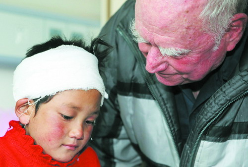 西安交通大学第一附属医院上百名医护人员、40多名藏族实习学员,全力救治来自青海玉树的20名伤病员。经过几天的细心治疗和照顾,20名伤员病情稳定。4月18日早上,病房里面还来了一名特殊的志愿者——82岁的美国志愿者史蒂芬正在用不流利的汉语鼓励7岁的藏族小女孩阿依玛珠。CFP供图