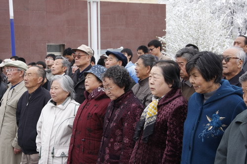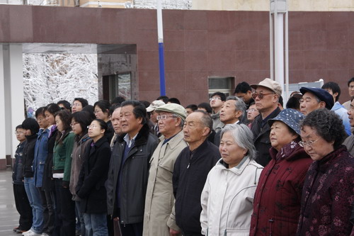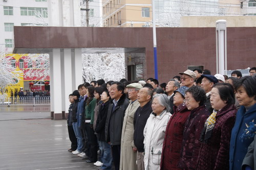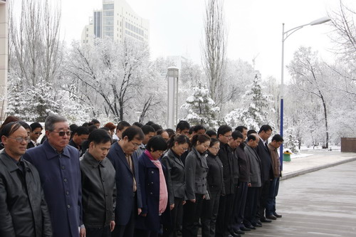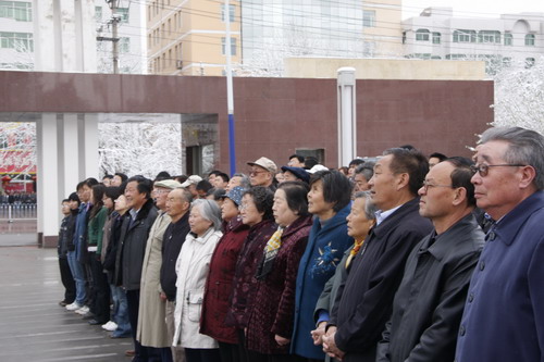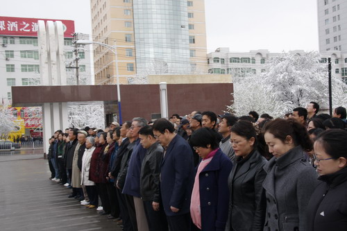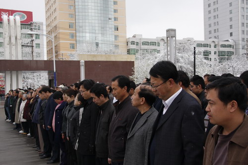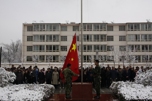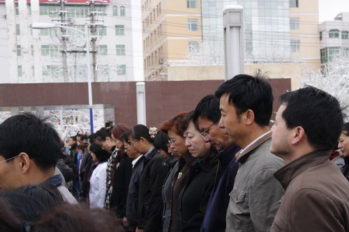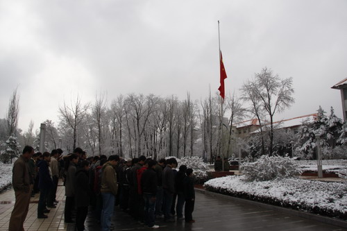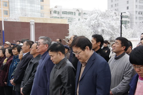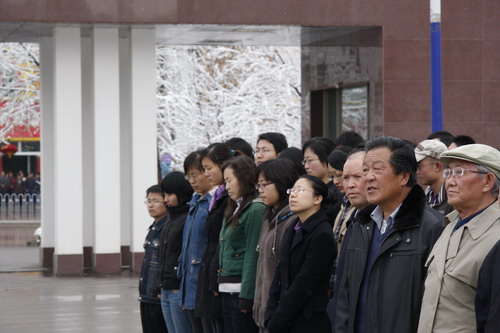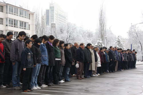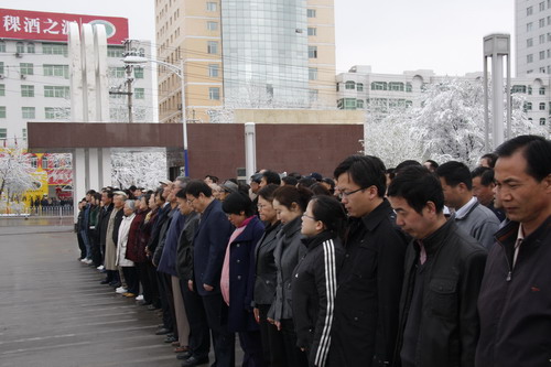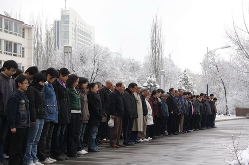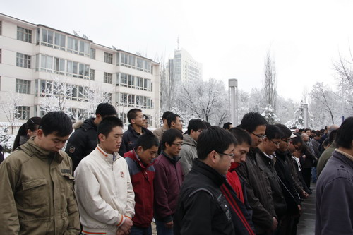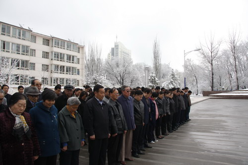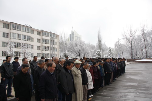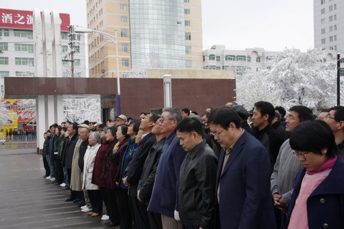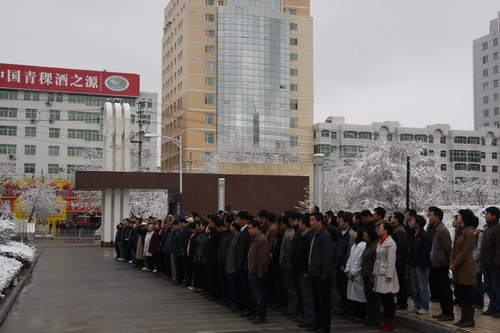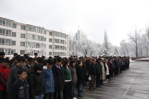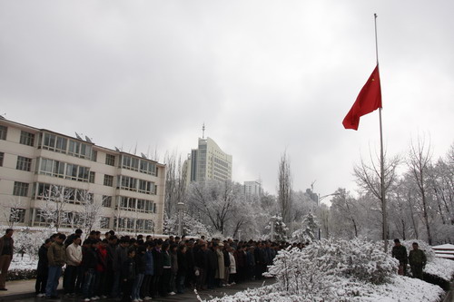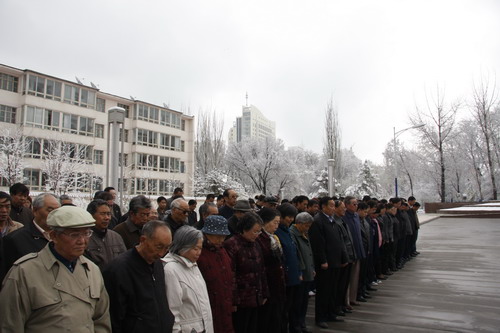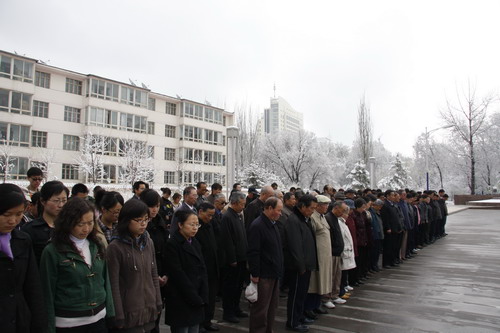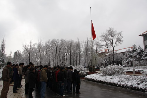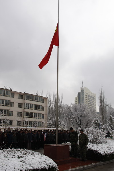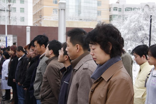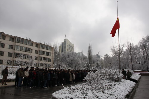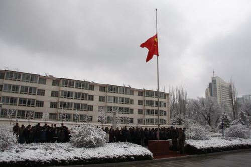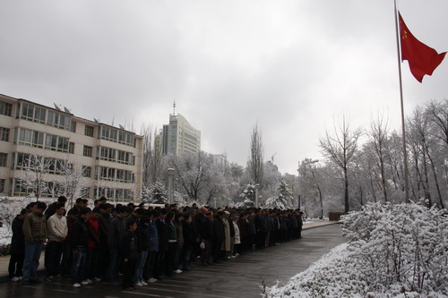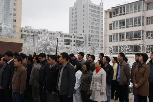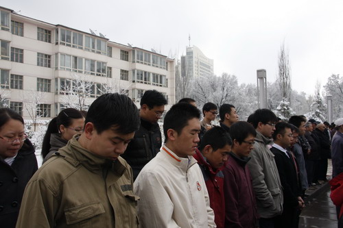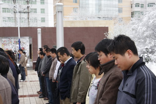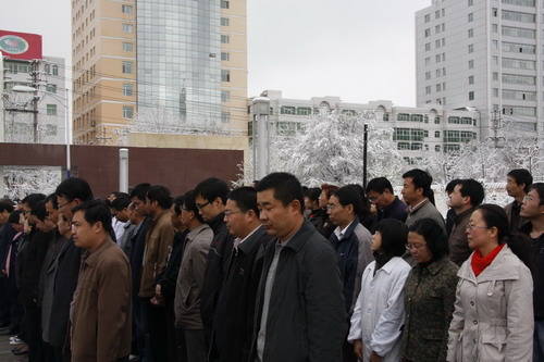 21日早,大雪未歇,高原古城西宁笼罩在悲恸的气氛中,西北高原所很多离退休老职工不顾恶劣的天气,早早就来到了工作区国旗前,9:50,所内职工、研究生、聘用人员等陆续集中到国旗前,上午10时正,全所职工为玉树地震遇难同胞举行哀悼活动,现场降半旗,所有人员驻足默哀,所有车辆鸣笛。防空警报声在城市上空回响。(撰稿人:杨勇刚)