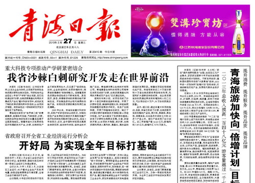 此外,据介绍,通过该重大专项的推动,目前,我省已形成了沙棘、白刺资源开发的完整的产业链,果汁类、果酒类、果粉类、保健食品、化妆品及中间体七大类60多个产品上市,部分产品实现了出口创汇。近三年新增产值10.03亿元;新增利税1.89亿元;新增外汇5370万美元。(青海日报 记者/张海虎 2013/2/27)
