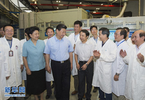 上午9时许,习近平来到中国科学院西郊科教园区,首先考察了高能物理研究所。习近平走进实验区3号厅,考察我国第一个大科学装置北京正负电子对撞机。在高能物理所所长王贻芳的介绍下,他仔细察看对撞机加速器模型、储存环等,了解该所在粒子物理、先进加速器技术、先进射线技术领域的发展成就和建设世界级科研中心的计划,不时同科研人员交流。