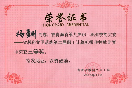 杨勇刚荣获青海省教科文卫系统第二届职工计算机技能竞赛三等奖
