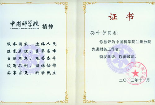 西高所孙千宁同志荣获中科院兰州分院先进财务工作者