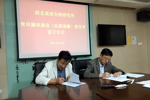 为认真贯彻落实中国科学院党组关于党风廉政建设责任制的工作部署和要求,6月26日上午,中国科学院西北高原生物研究所举行了党风廉政建设(反腐倡廉)责任书签订仪式。党委书记、所长张怀刚主持签字仪式,并与党委委员、副所长陈世龙,党委副书记兼纪委书记、副所长王萍签订了党风廉政建设责任书,与副所长魏立新签订了反腐倡廉责任书;随后,所领导与其主管的各部门负责人签订了党风廉政建设(反腐倡廉)责任书。